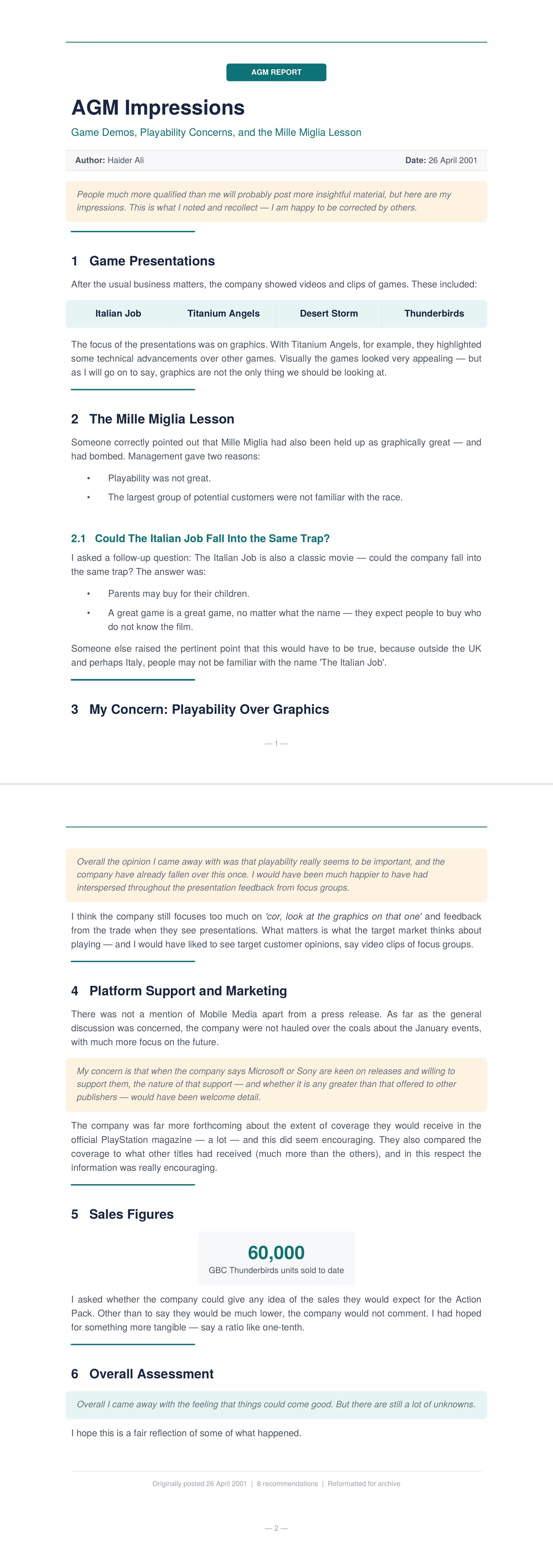 SCi Entertainment, which would later become Scidos. This investment was as much about the company as being part of a community of investors, who shared a lot of information and made it a profitable experience in many ways.