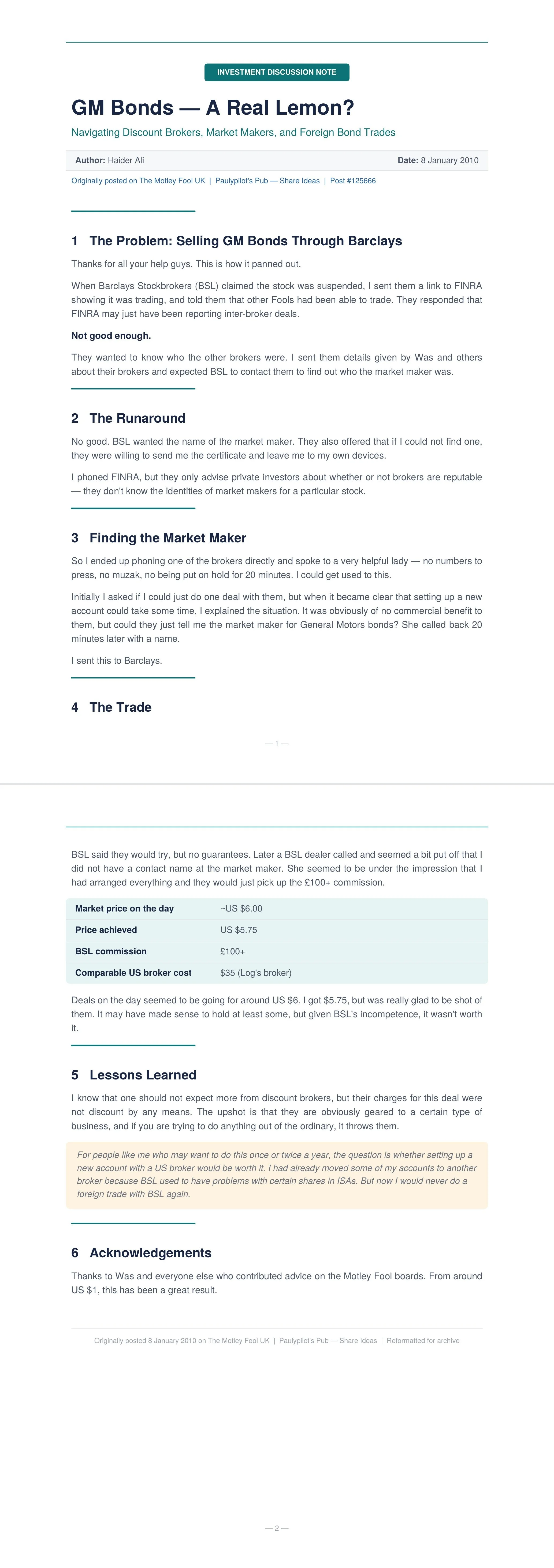 The final post in the document deals with my experiences of being a Barclays Stockbrokers customer, specifically how they expected me on one occasion to find the marketmaker for General Motors' bonds, since they did not know who it was. The post explains how the collective group of TMF bulletin board members helped to solved the problem.